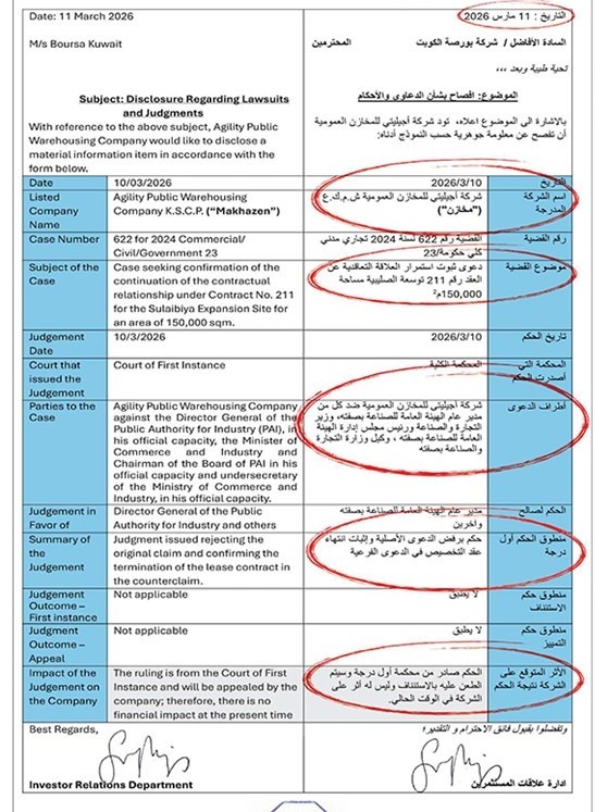 The Boursa Kuwait announced on its official website on Wednesday, March 11, 2026, a disclosure submitted by Agility Public Warehousing Company (Agility), regarding a legal case related to the Sulaibiya expansion project.