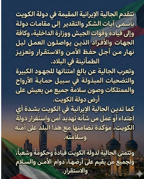 The Iranian community residing in the State of Kuwait expresses its sincere appreciation and deep gratitude to the Kuwaiti authorities, the leadership and personnel of the Armed Forces, the Ministry of Interior, and all institutions and individuals who work tirelessly around the clock to maintain security, stability, and public safety in the country.