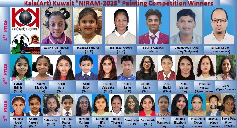 Winners of Painting Competition titled “NIRAM 2025” have been adjudged by the well-known Artists Sasi Krishnan, Sunil Kulanada, Hari Chengannur and Vishnu Jayakrishnan appointed by the Executive Committee of “Kala(Art) Kuwait” and accordingly the Lists of Winners are being released by the organizers as follows: