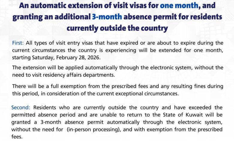 Visit visas expiring around 28 Feb 2026 are automatically extended for 1 month without fees or immigration visits. Residents outside Kuwait who exceeded absence limits receive a 3-month absence permit automatically. Periods may be extended depending on developments.