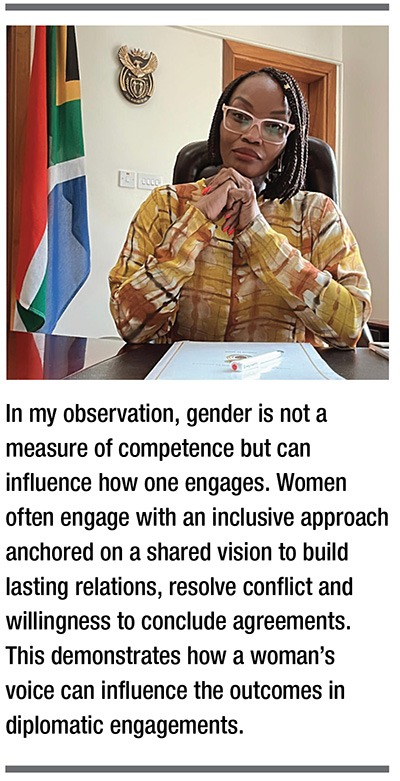 Diplomacy should be inclusive and non-discriminatory. For me as a South African diplomat, our democracy has taught me that inclusion is not a weakness, but a strength. As diplomats, we have a unique responsibility and opportunity to mirror the diversity, values and interests of the people we represent. As a result, our work must reflect the authentic voice of our societies, ensuring that every policy, negotiation and engagement speak for the realities, aspirations, and needs of those we serve.